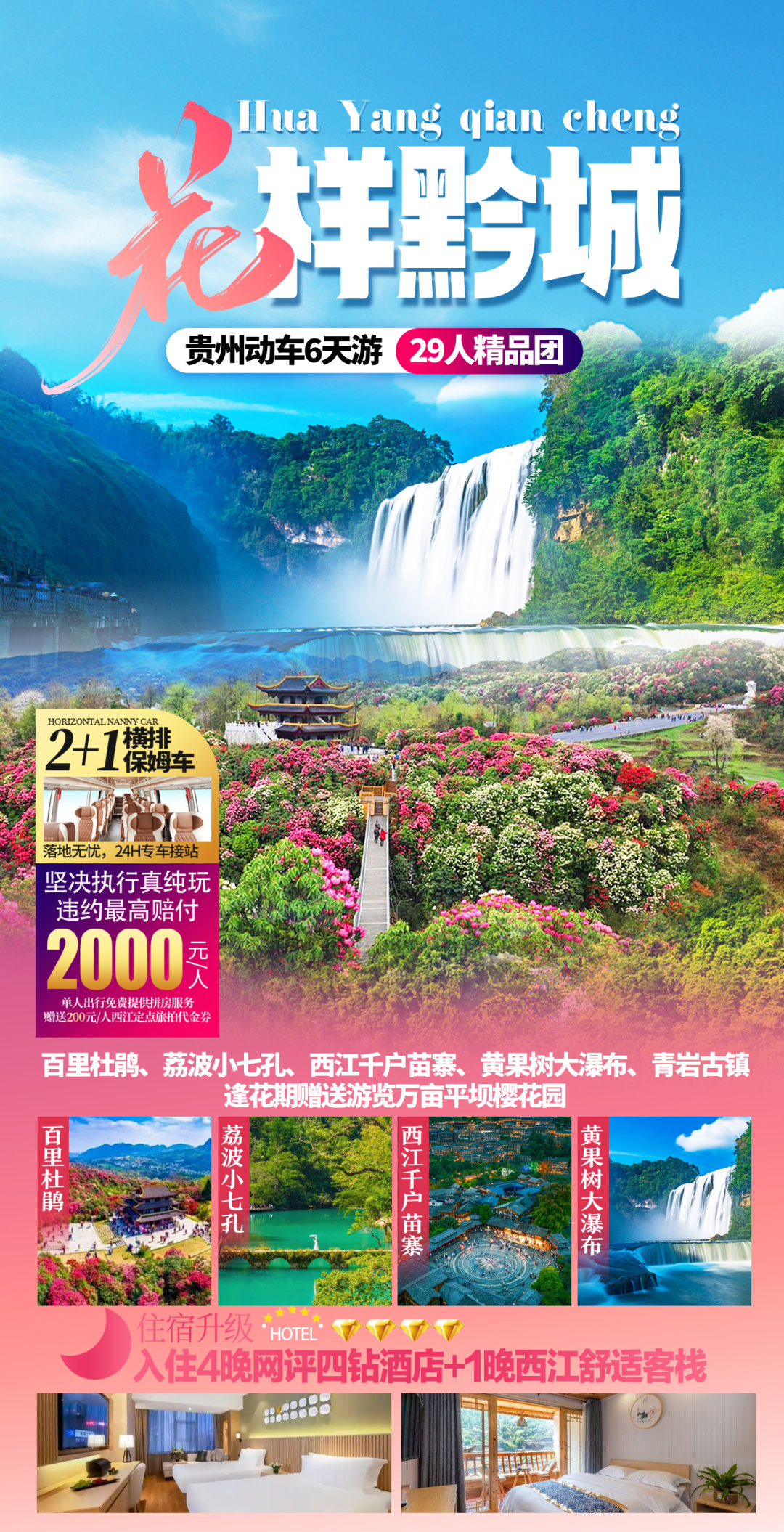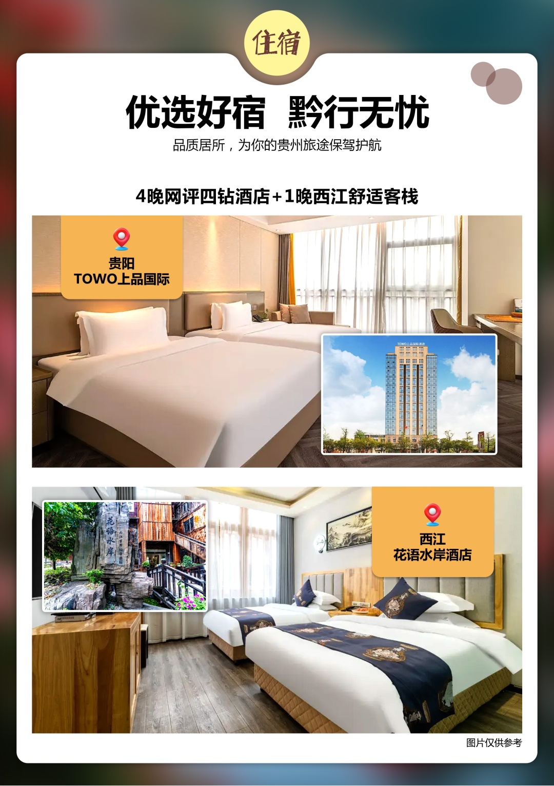 2. 住宿:四晚网评四钻+1晚西江精品客栈,如需单人用一间房请自行另补单房差或者接受安排拼房。