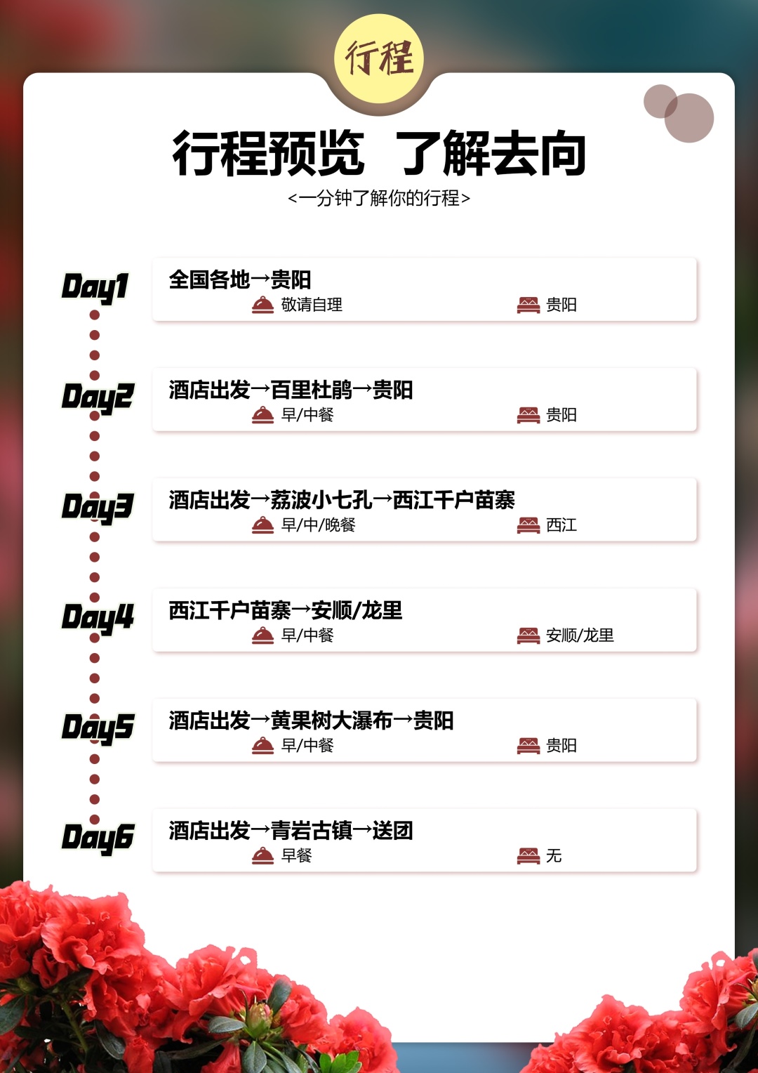 3. 用餐:行程中团队标准用餐(人数不足10人,则菜品数量相应减少),含5早5正餐,40元/人/餐的标准。(当地特色美食,地道黔味体验;行程中备注不含用餐敬请自理,如因自身原因放弃用餐,则餐费不退)