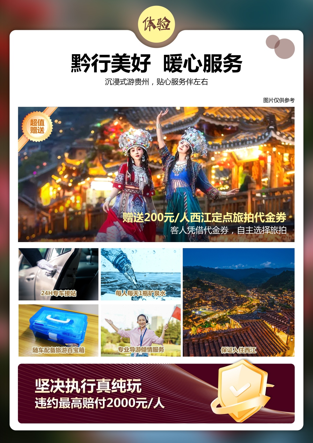 4. 赠送200元/人西江定点旅拍代金券(可在西江指定旅拍点使用,不可折现,单张代金券只能使用一次)。