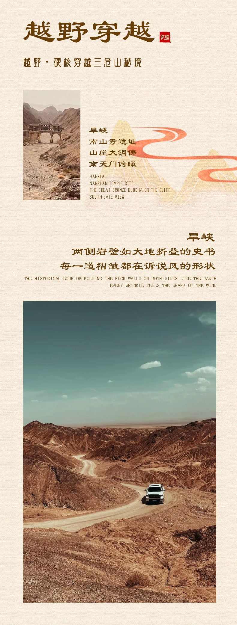 用车 | 根据出行人数选择相对应车型,每人限携带一个24寸以内行李箱,如有行李不符问题请提前咨询客服 散拼车型安排: D2天霸道/坦克三百同级硬派越野车穿越1日+D3-D4 日2天5座SUV(奇骏+长城+起亚+哈佛)或同级车型用车; 私家小团车型安排: D2天霸道/坦克三百同级硬派越野车穿越1日+D3-D4 日2天7座商务车型用车; | |