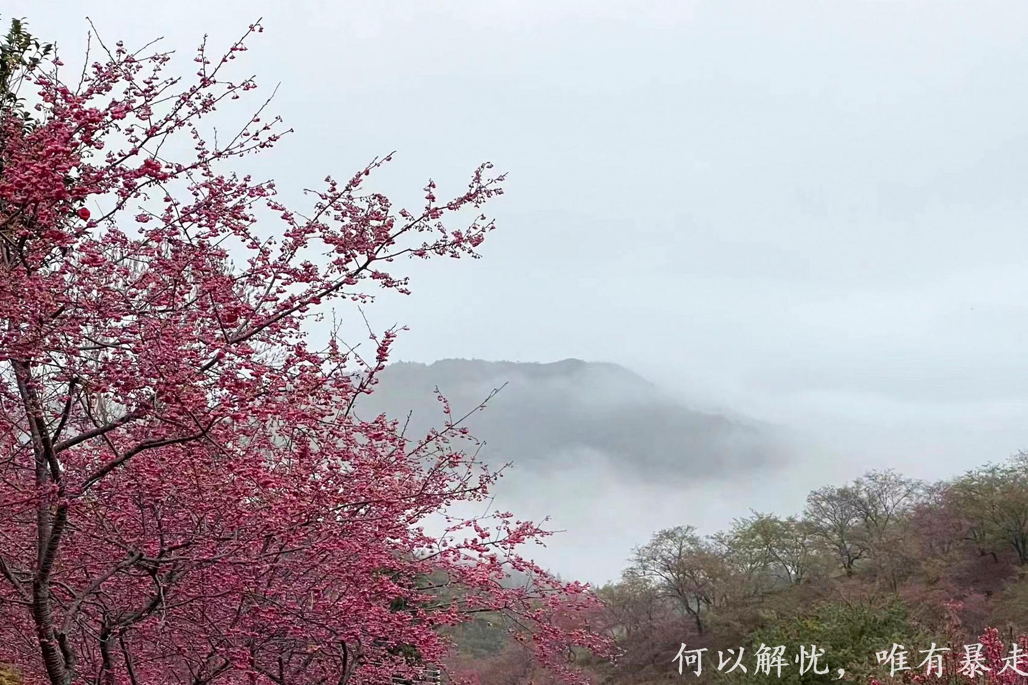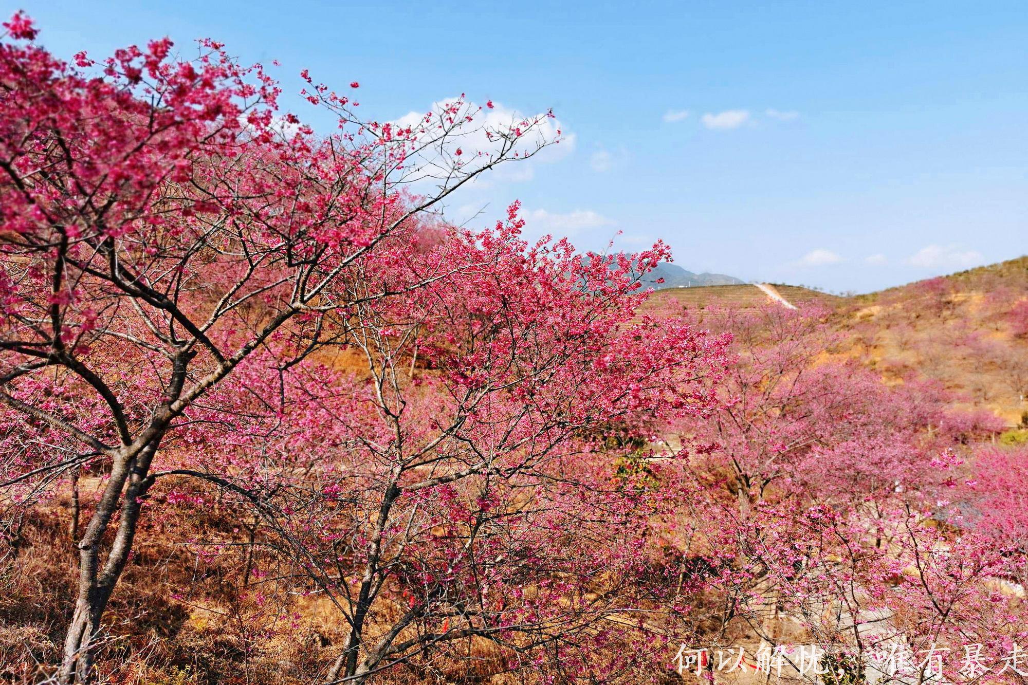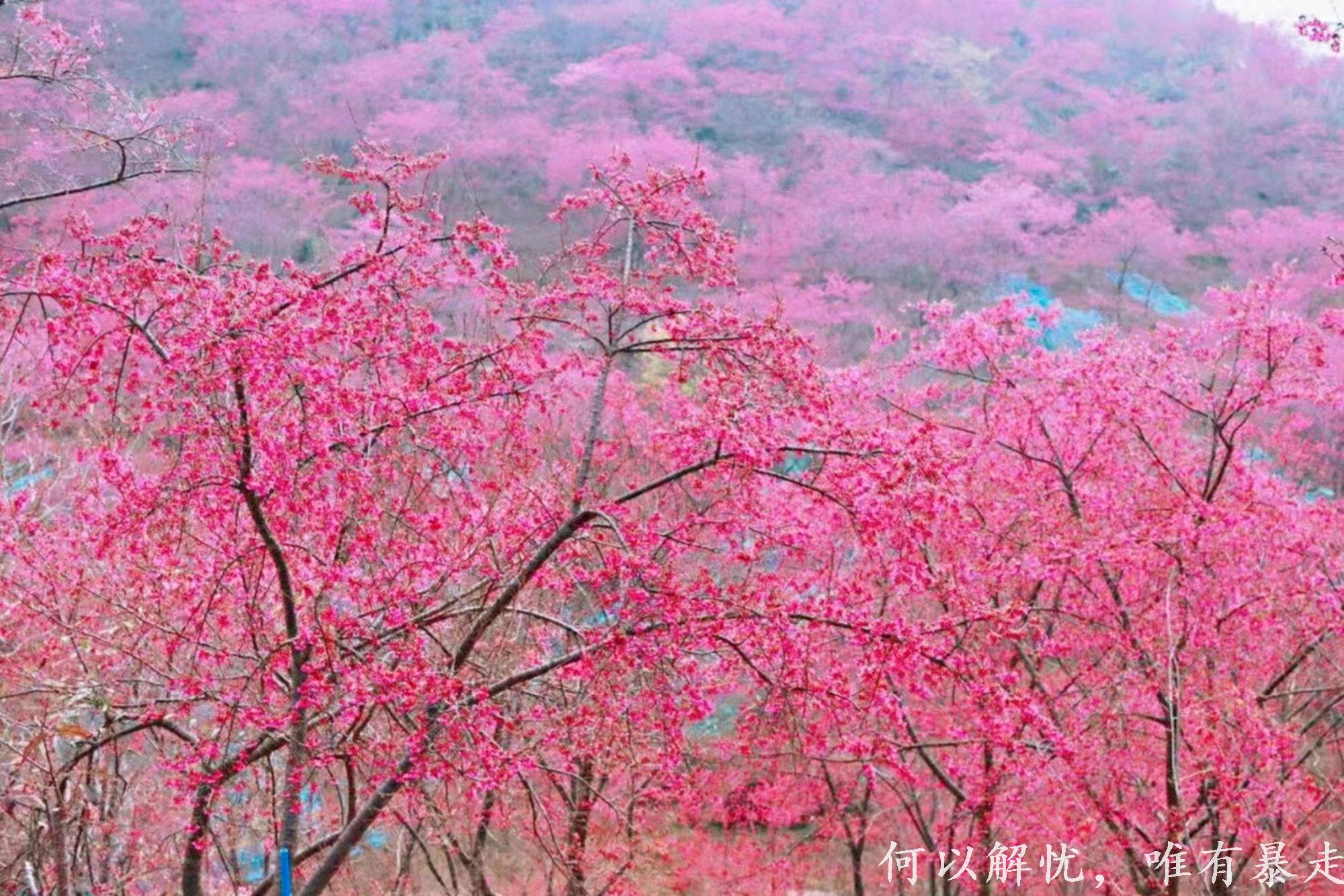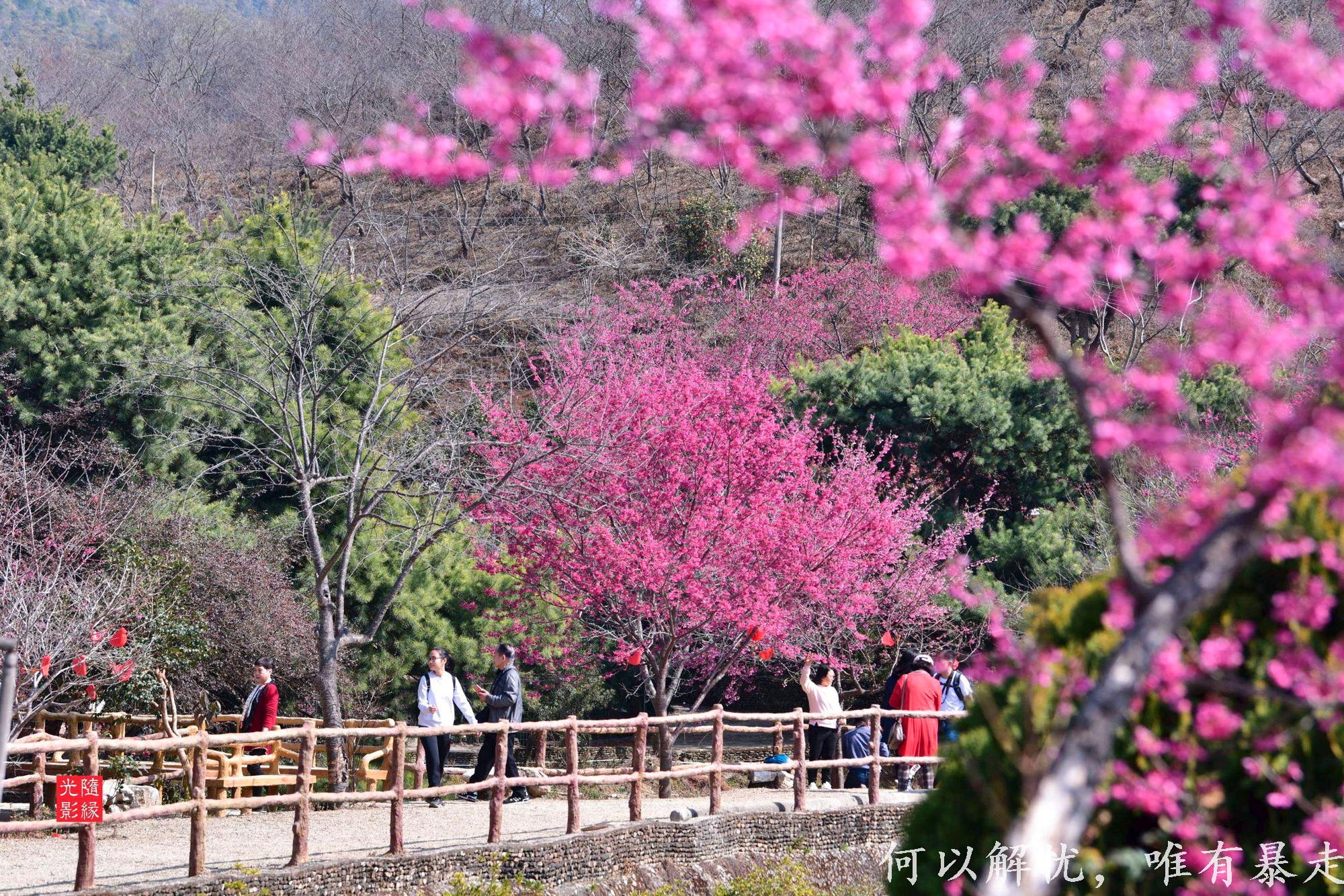 樱花峪两边的山坡上,一树树怒放的樱花,似一团绯云海。走近一看,樱花一串串的犹如铃铛悬于枝头,花梗细长而下垂,又像一盏盏红灯。周末时光,约上三两好友,带着满心的喜悦争相与樱花合影,亲近大自然,吸取初春的气息。