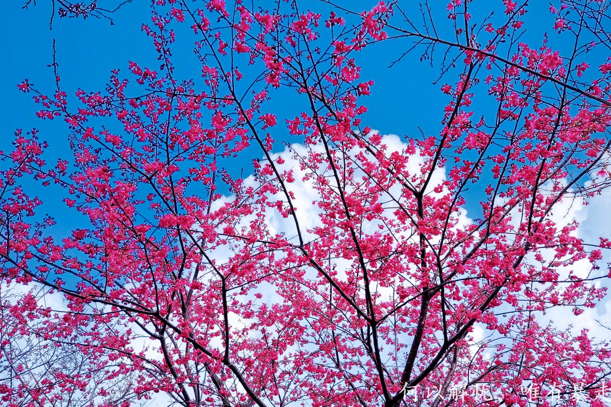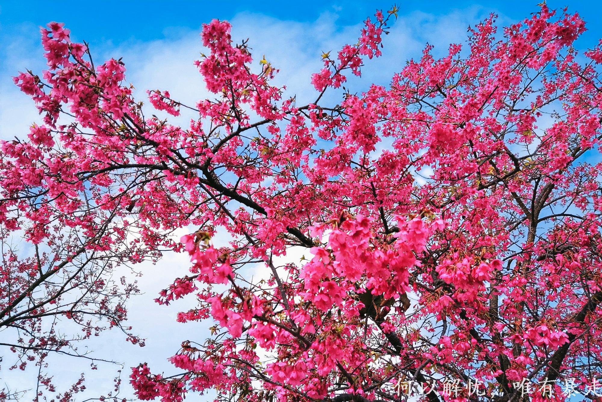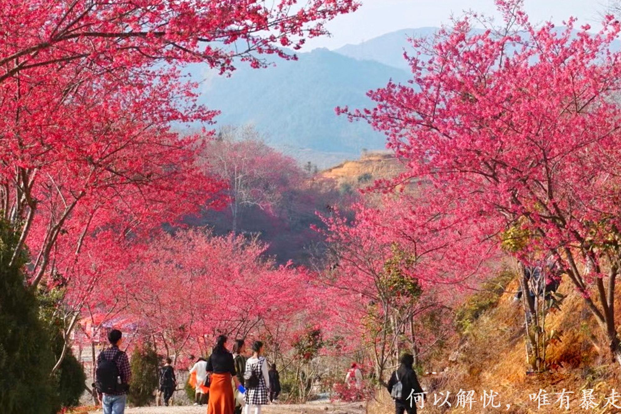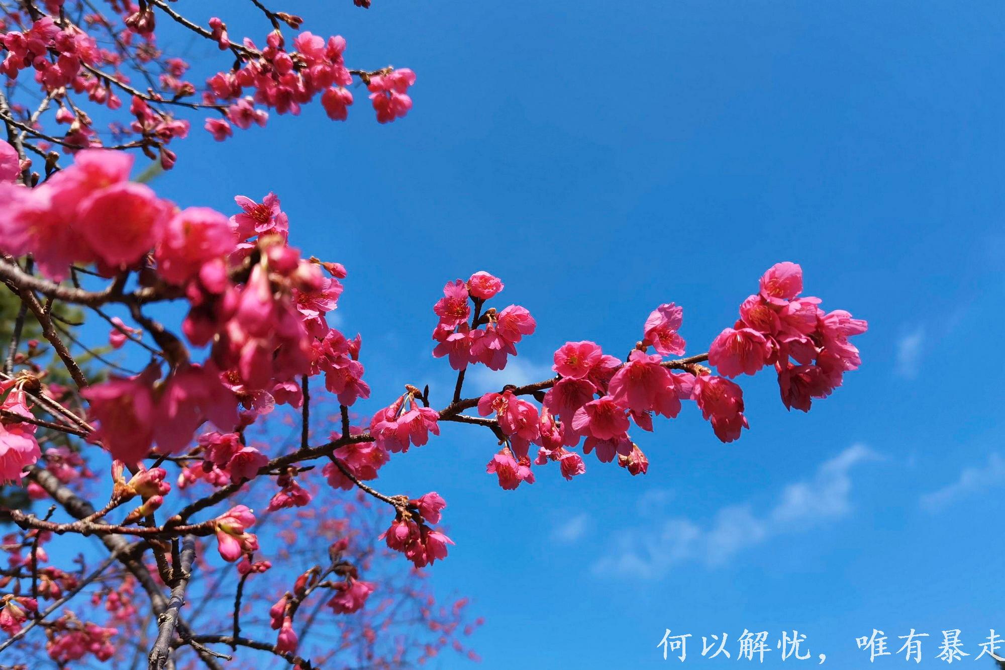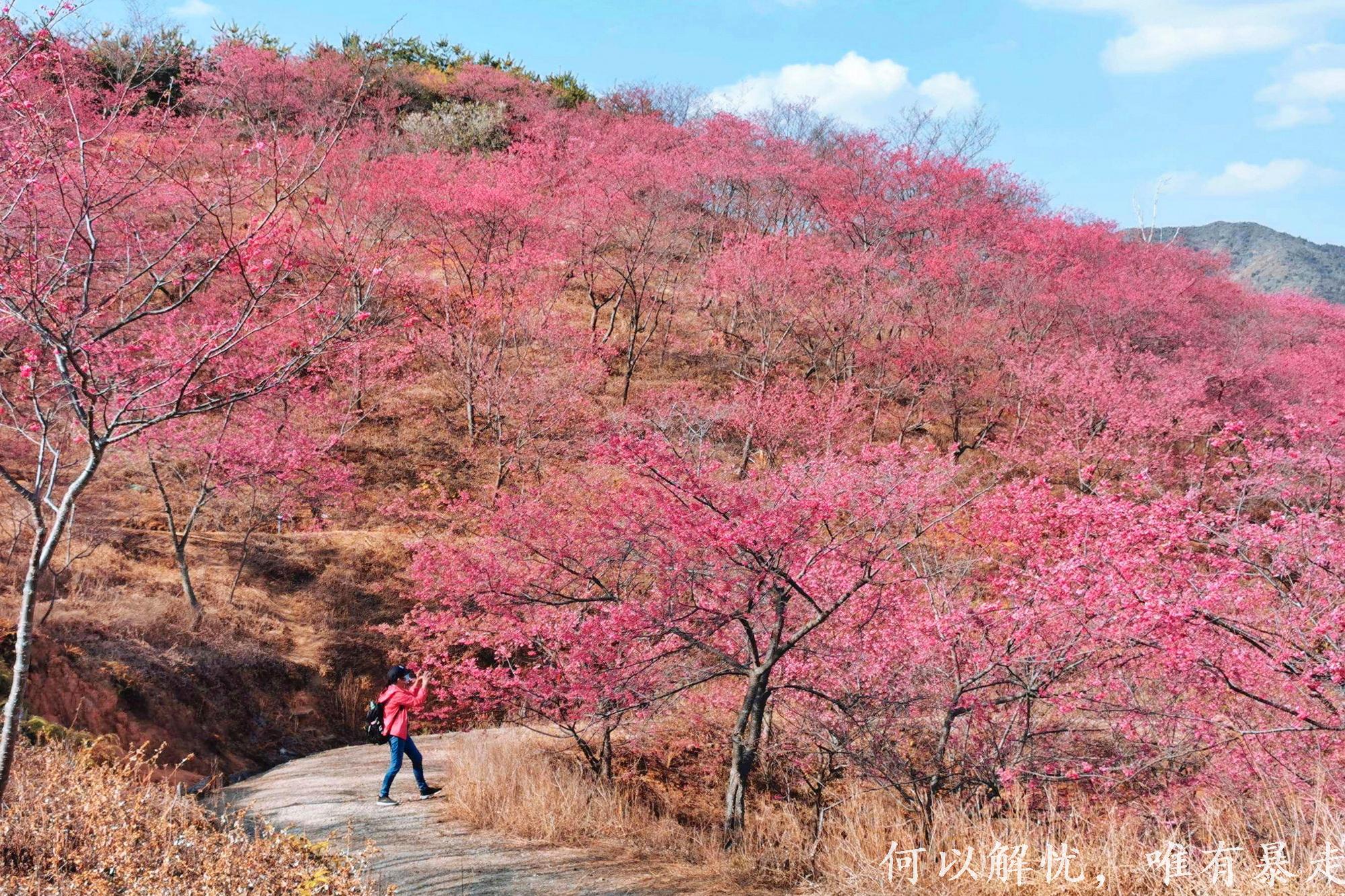 樱花峪两边的山坡上,一树树怒放的樱花,似一团绯云海。走近一看,樱花一串串的犹如铃铛悬于枝头,花梗细长而下垂,又像一盏盏红灯。周末时光,约上三两好友,带着满心的喜悦争相与樱花合影,亲近大自然,吸取初春的气息。