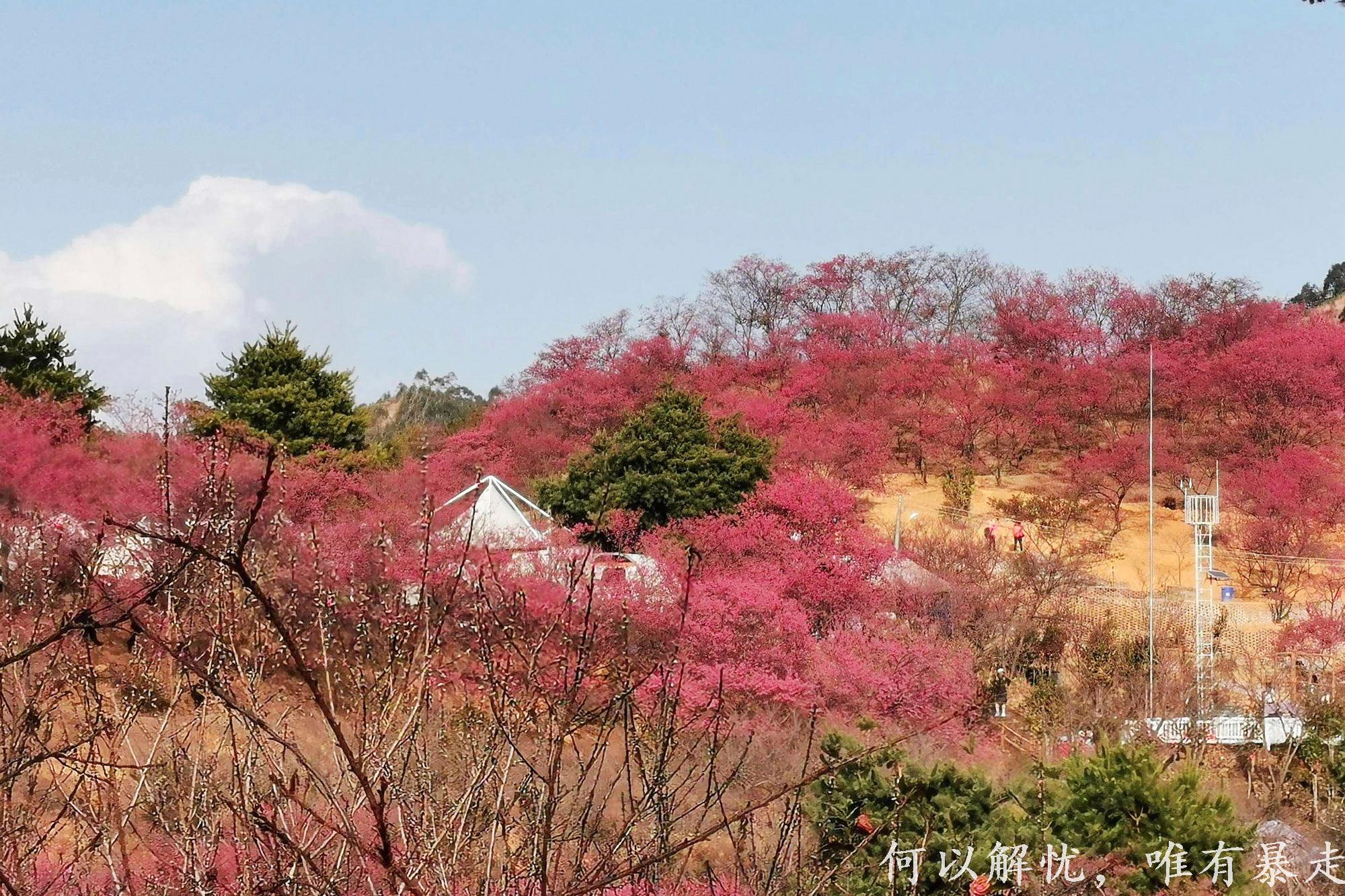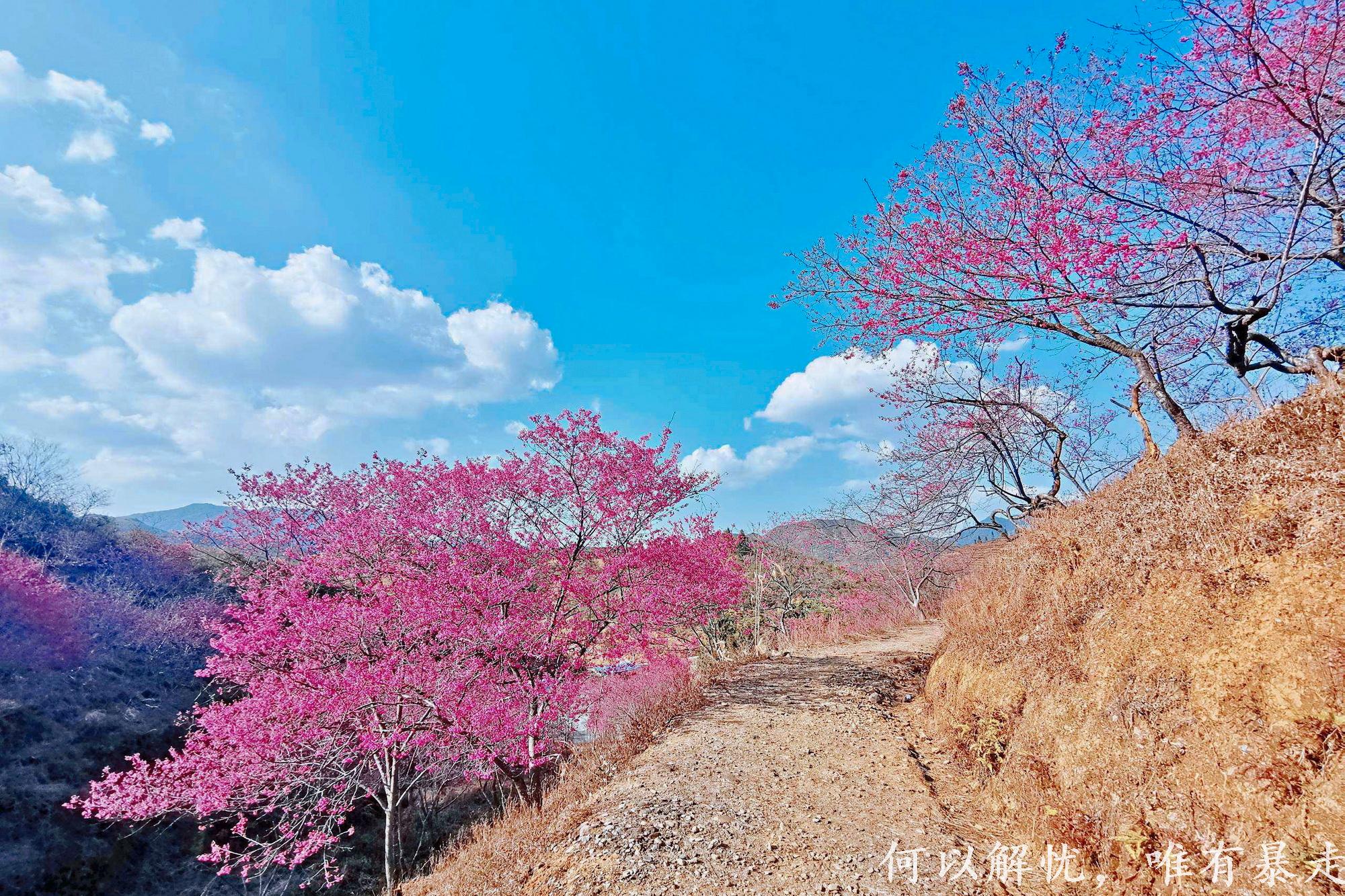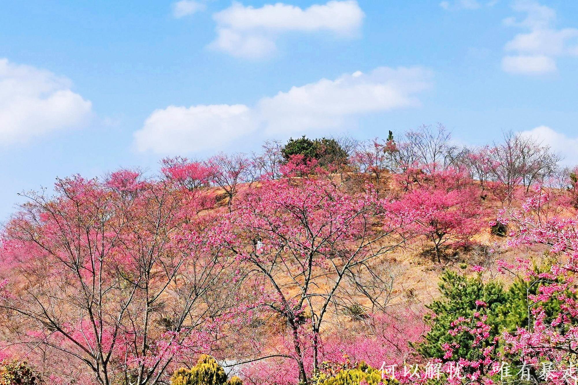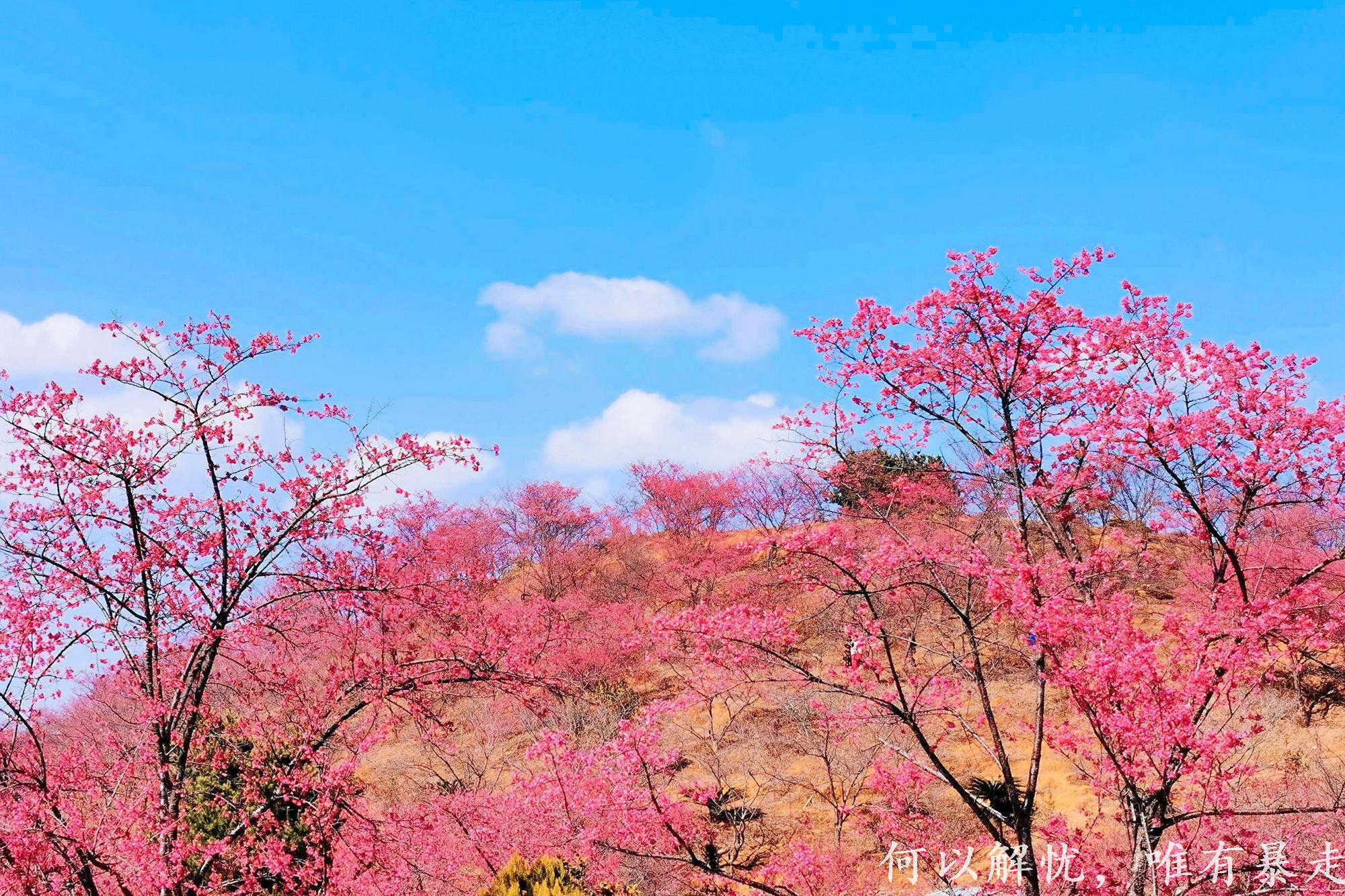 樱花峪两边的山坡上,一树树怒放的樱花,似一团绯云海。走近一看,樱花一串串的犹如铃铛悬于枝头,花梗细长而下垂,又像一盏盏红灯。周末时光,约上三两好友,带着满心的喜悦争相与樱花合影,亲近大自然,吸取初春的气息。