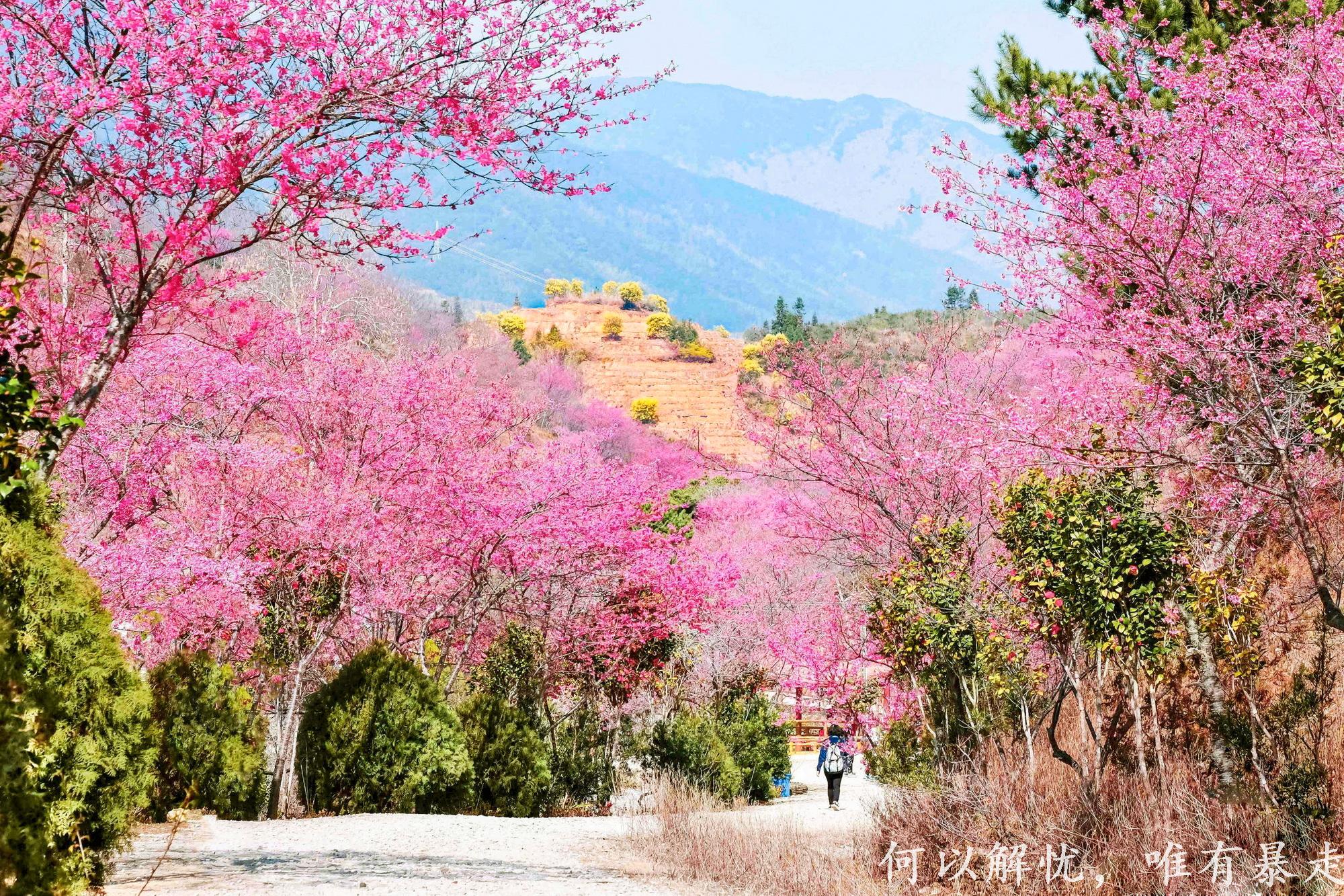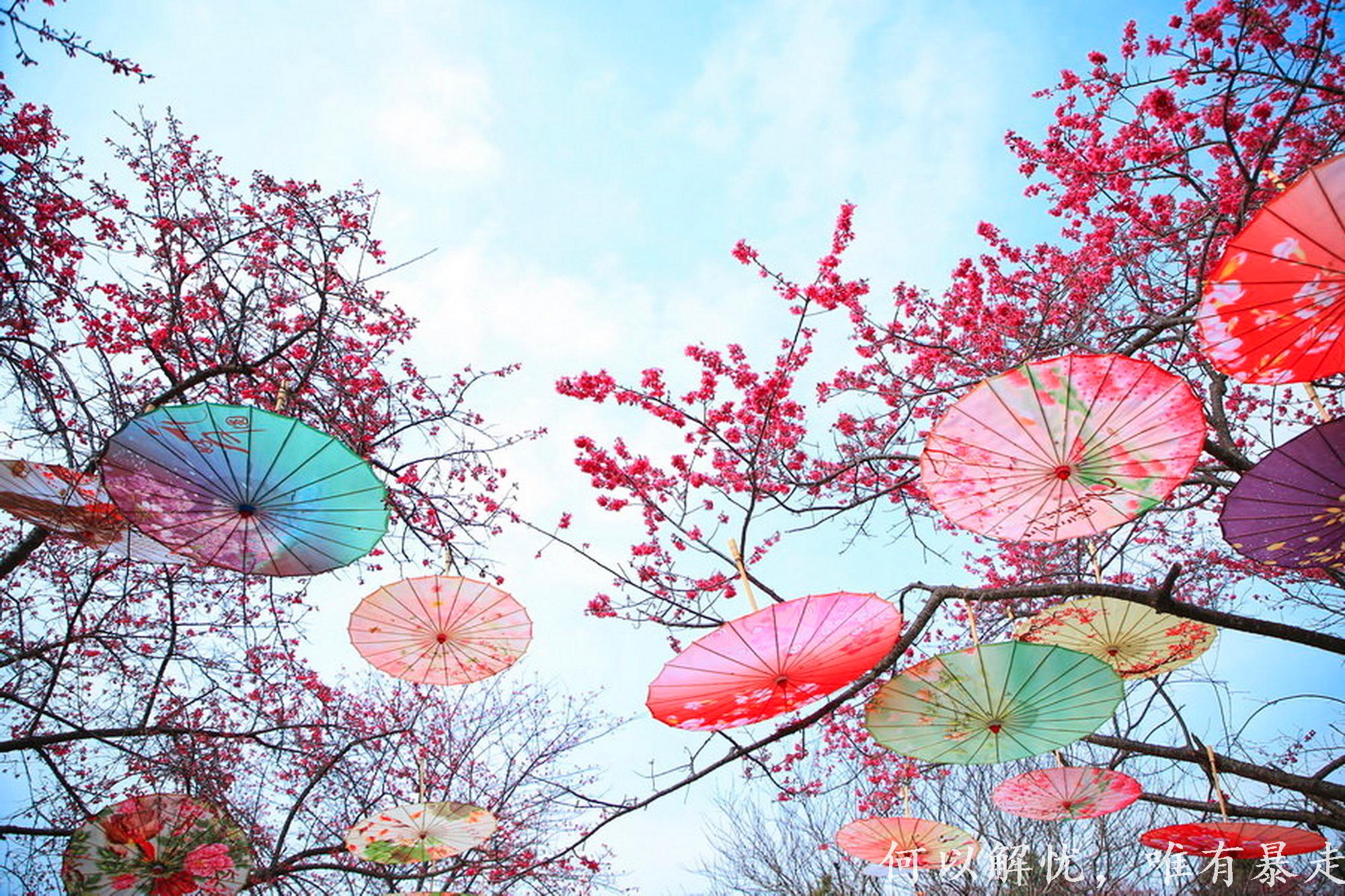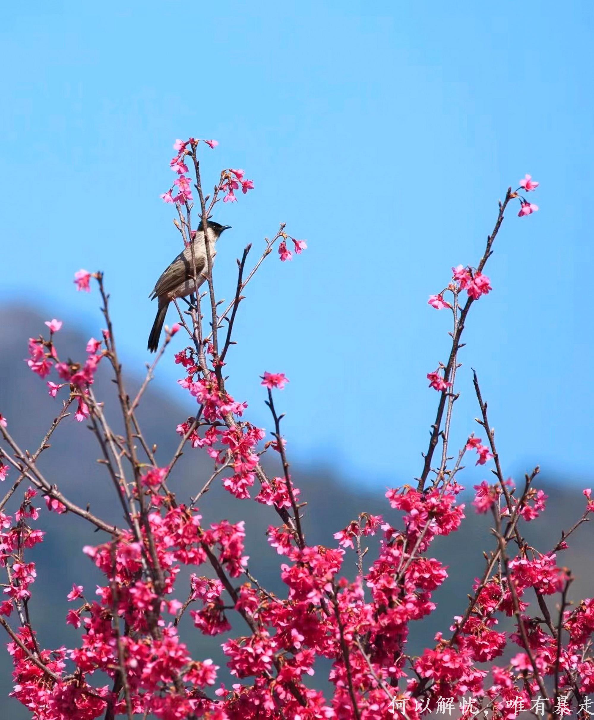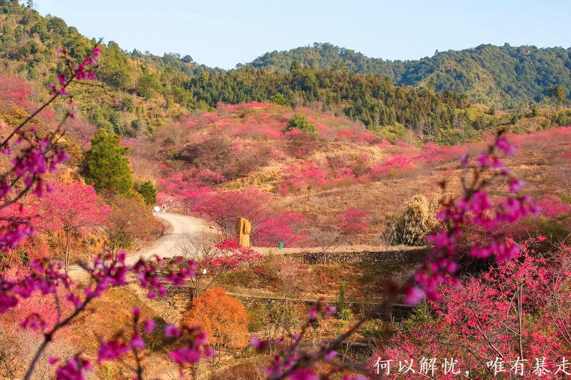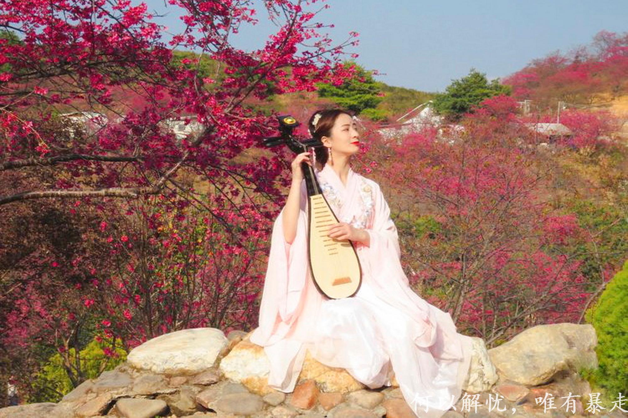 樱花峪两边的山坡上,一树树怒放的樱花,似一团绯云海。走近一看,樱花一串串的犹如铃铛悬于枝头,花梗细长而下垂,又像一盏盏红灯。周末时光,约上三两好友,带着满心的喜悦争相与樱花合影,亲近大自然,吸取初春的气息。