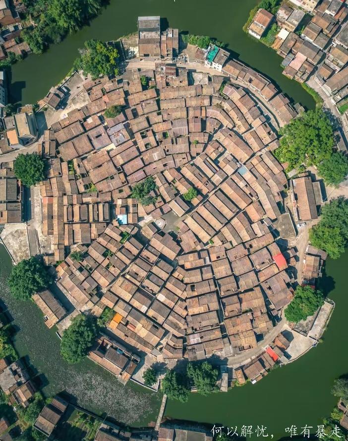 这些房屋依山而建,环水而设,以乾、坤、震、巽、坎、离、艮、兑等卦形排列,呈贺形分布,一座座一排排,一圈接一圈,玄机重重,风格独特。
