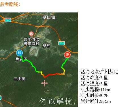 中等偏难全程约11公里(经过乱石坡、溪谷、山脊线、机耕路等各种路况),最高海拔942米,累计爬升约1000米