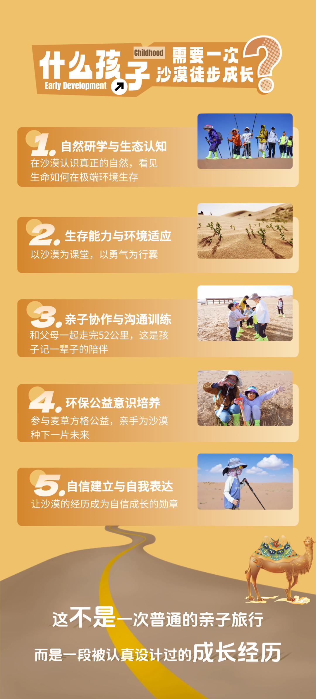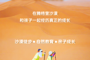 沙漠冲刺5KM:整理行装,进行最后一段徒步挑战。在最后一公里的时候,我们将看分队情况,将孩子与家长分开前行,让孩子有过一段属于自己在沙漠的独立时光,也让家长能有更多的时间和精力与沙漠来一次告别。家长在终点等待为冲线的孩子送上拥抱与鼓励。
