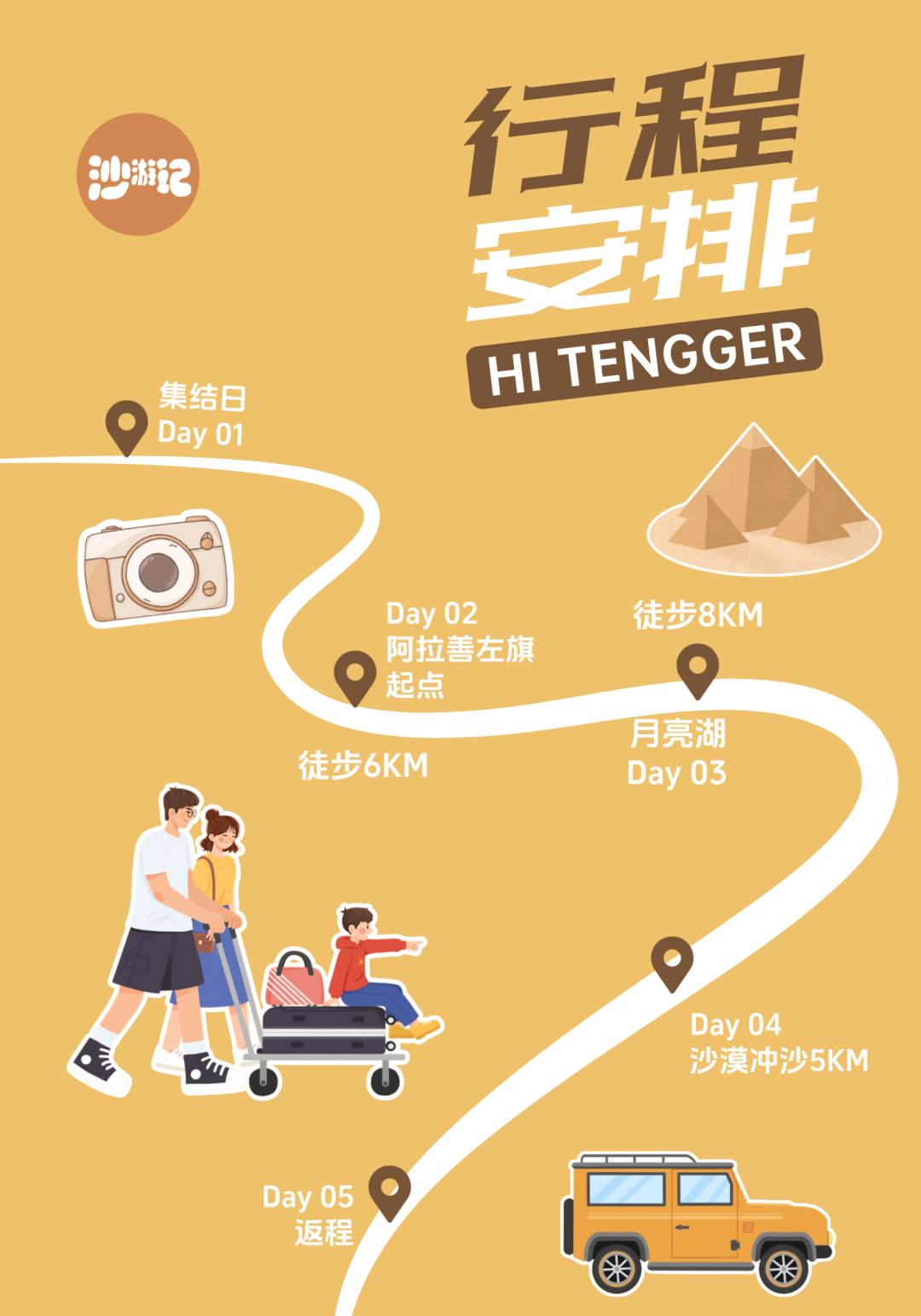 早上7:30起床洗漱,8:00乘坐大巴至沙漠入口,途中经验丰富的领队会在车上与大家互动,讲解西夏王陵、三关口等相关历史。除此之外,领队将会详细讲解沙漠环境下的防晒、防风、防沙以及科学补水策略。