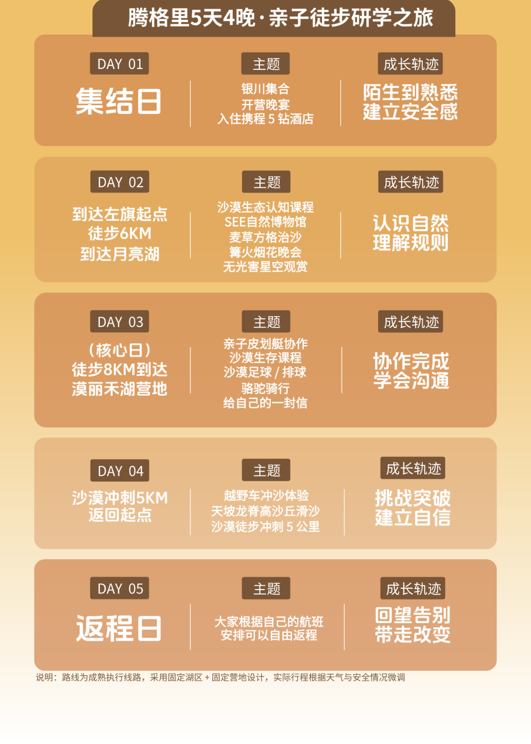 今日在安全规范的充分保障下,完成最后的挑战与突破。通过越野车冲沙与滑沙体验勇气与快乐;完成最后5KM的沙漠冲刺,将“我可以”的信念化为脚下的每一步;在闭营仪式中回顾旅程,将收获与荣耀正式封存。