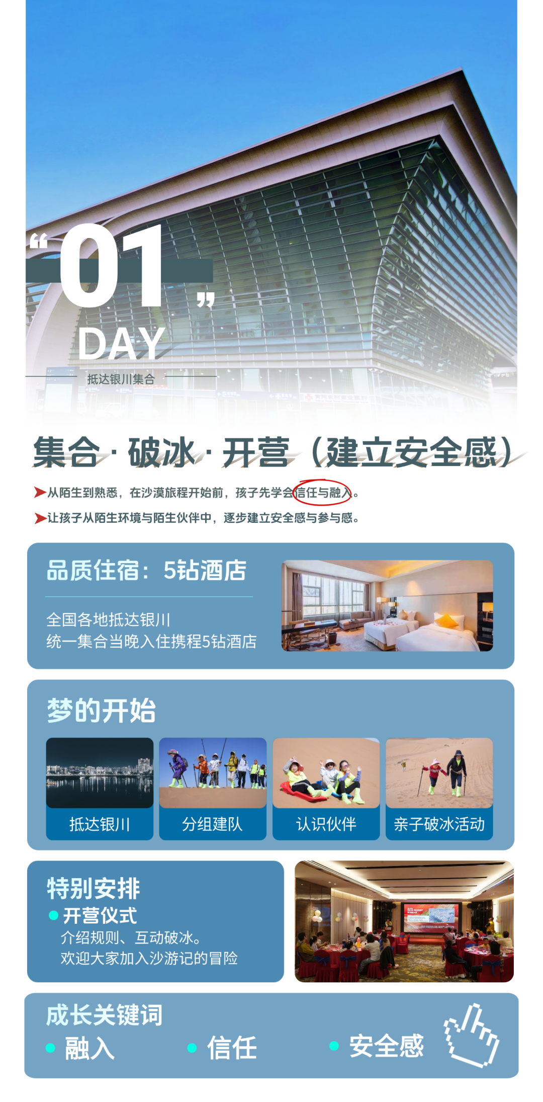 今日目标:从抵达银川的陌生,到破冰相识的熟悉,帮助每个家庭快速建立安全感与团队参与感。通过分组、讲解营规与安全须知,让孩子们安心、期待地开启沙漠之旅。
