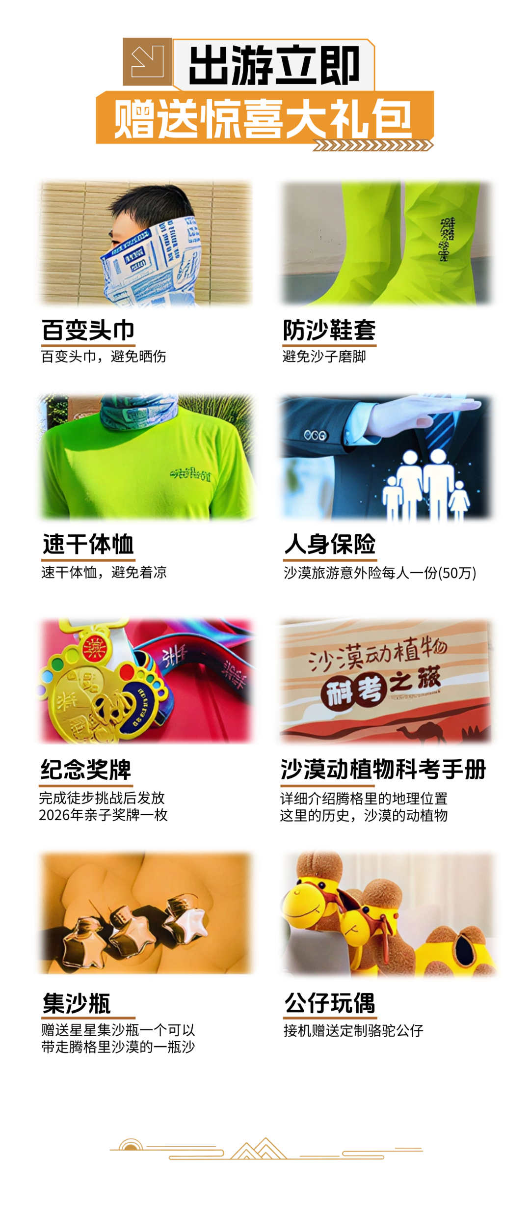 赠送装备:百变头巾、防沙鞋套、定制速干T恤、旅行意外险、完成挑战后的纪念奖牌、集沙瓶、沙漠动植物科考手册等(赠品以实际发放为准)