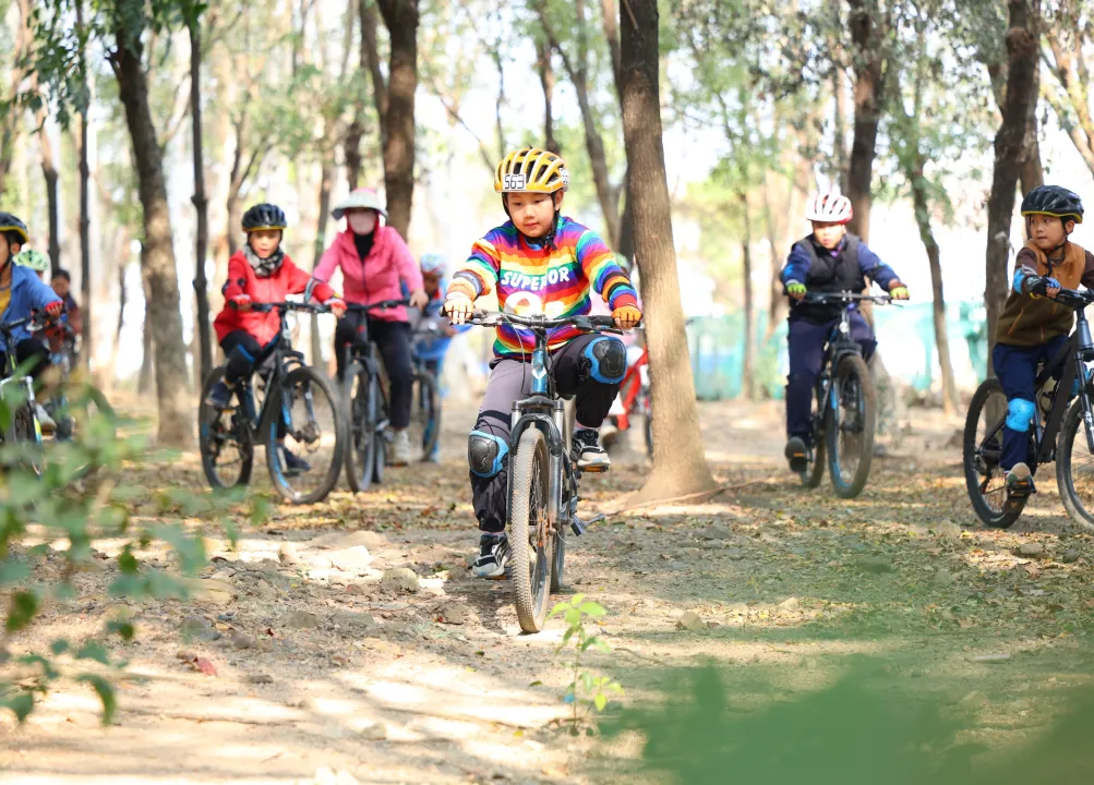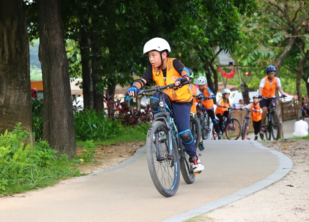 途中穿插趣味技能训练:慢骑 PK 赛、专业姿势矫正、绕标车感练习,边骑边练趣味十足
