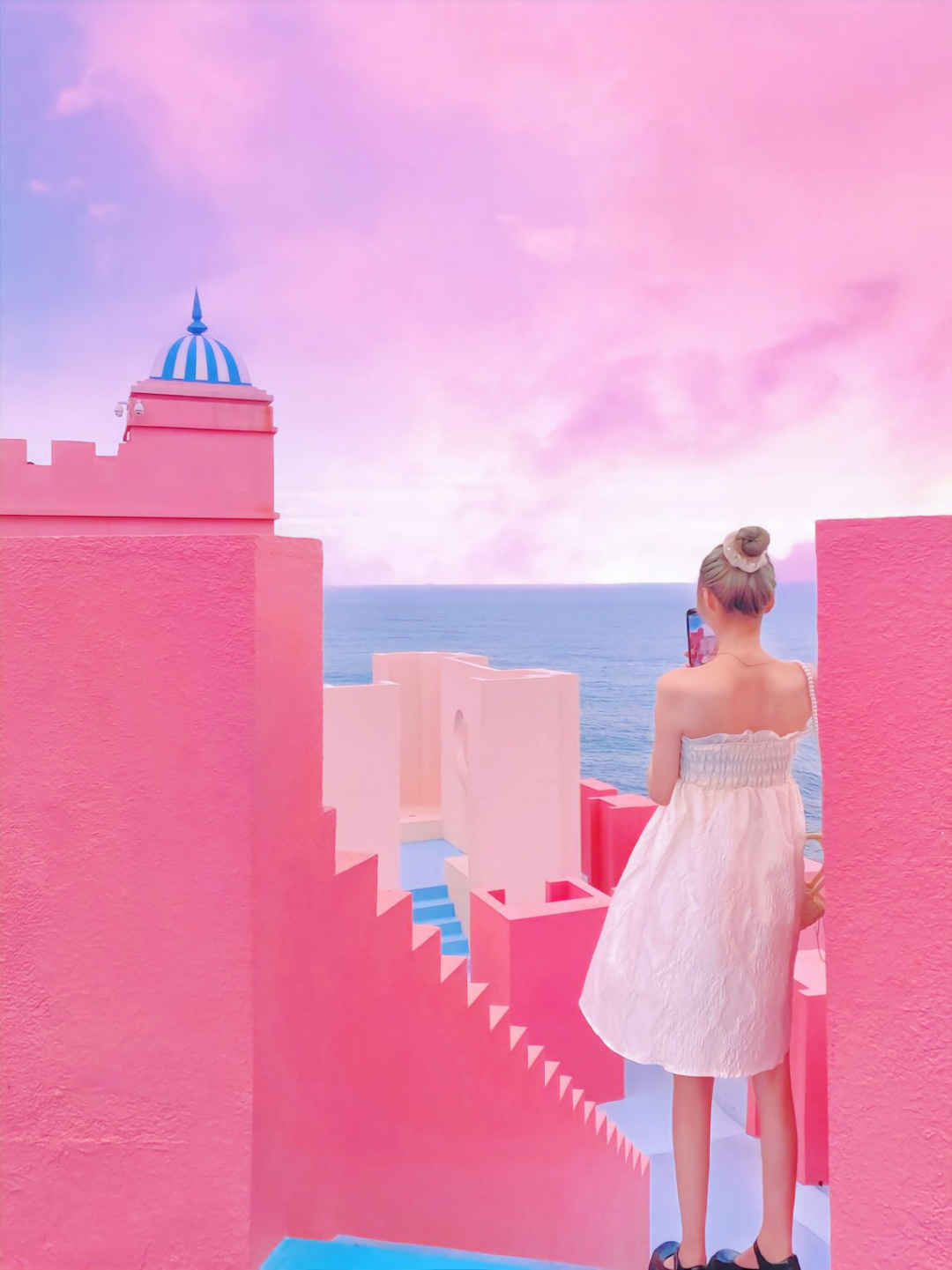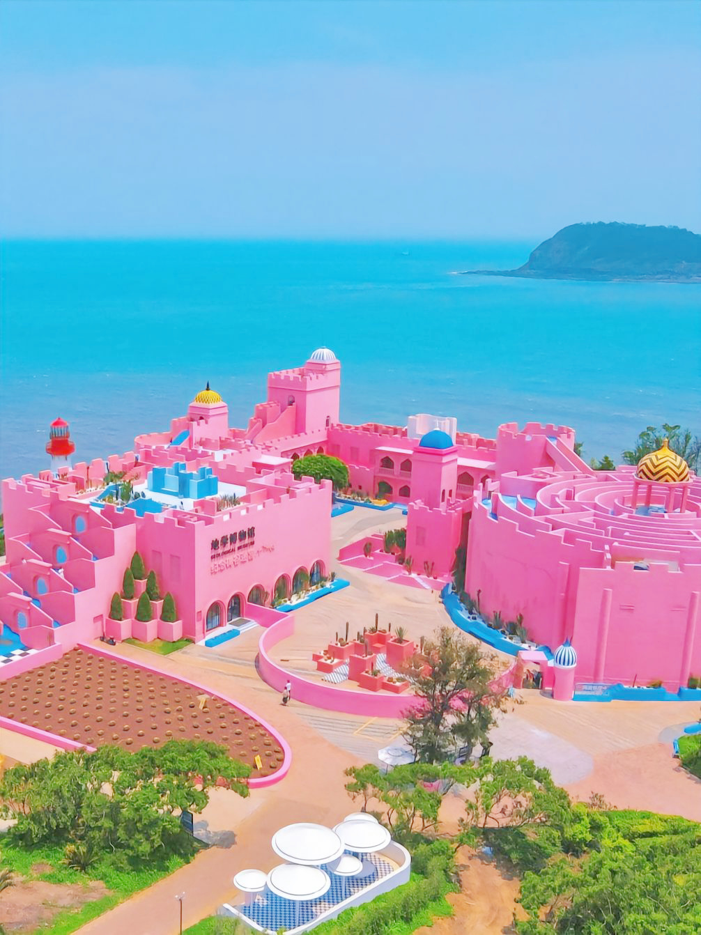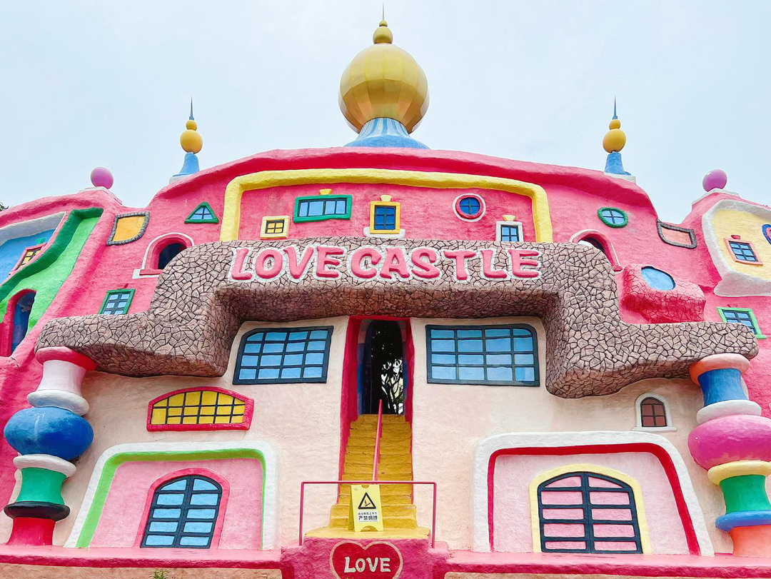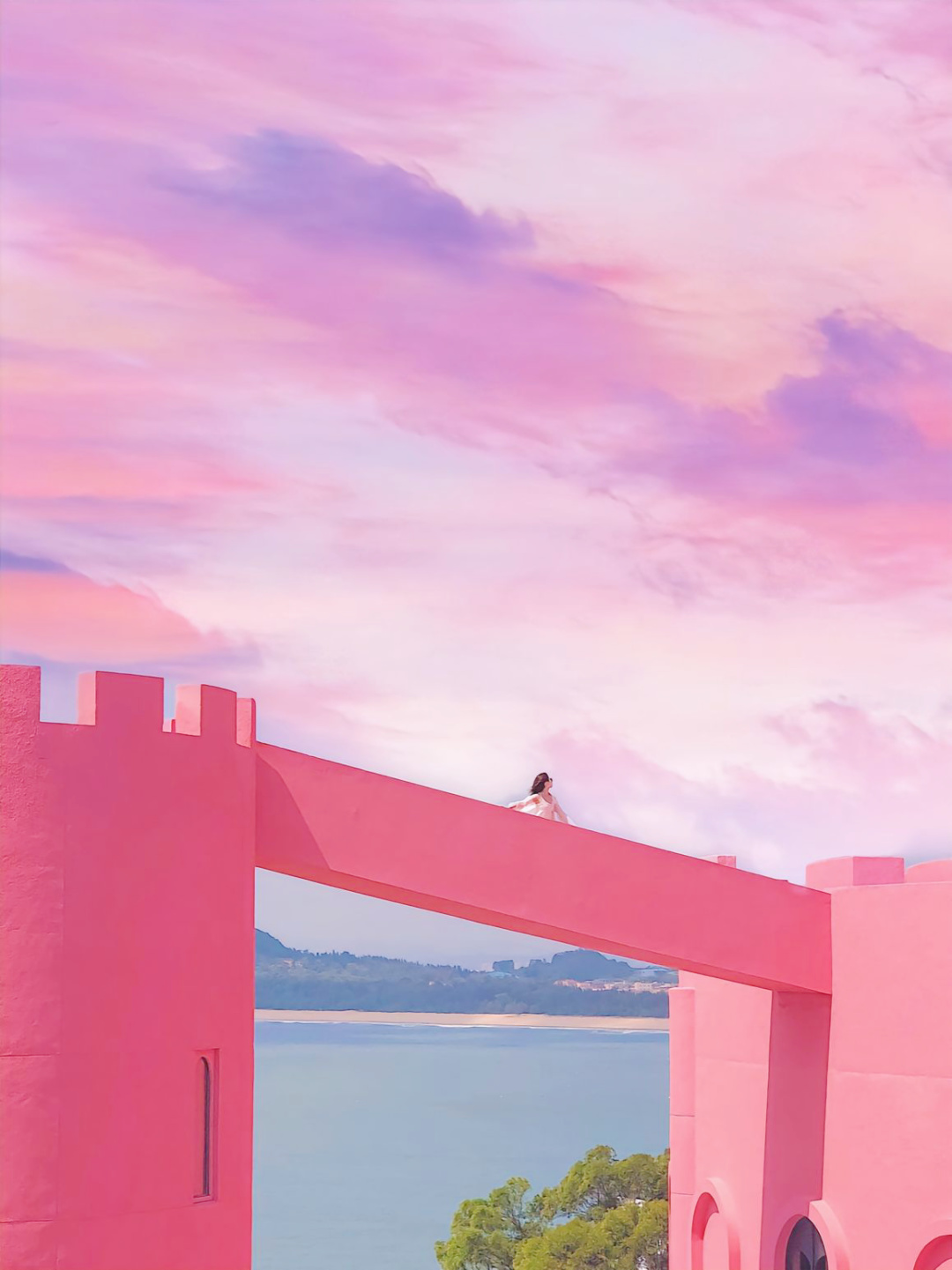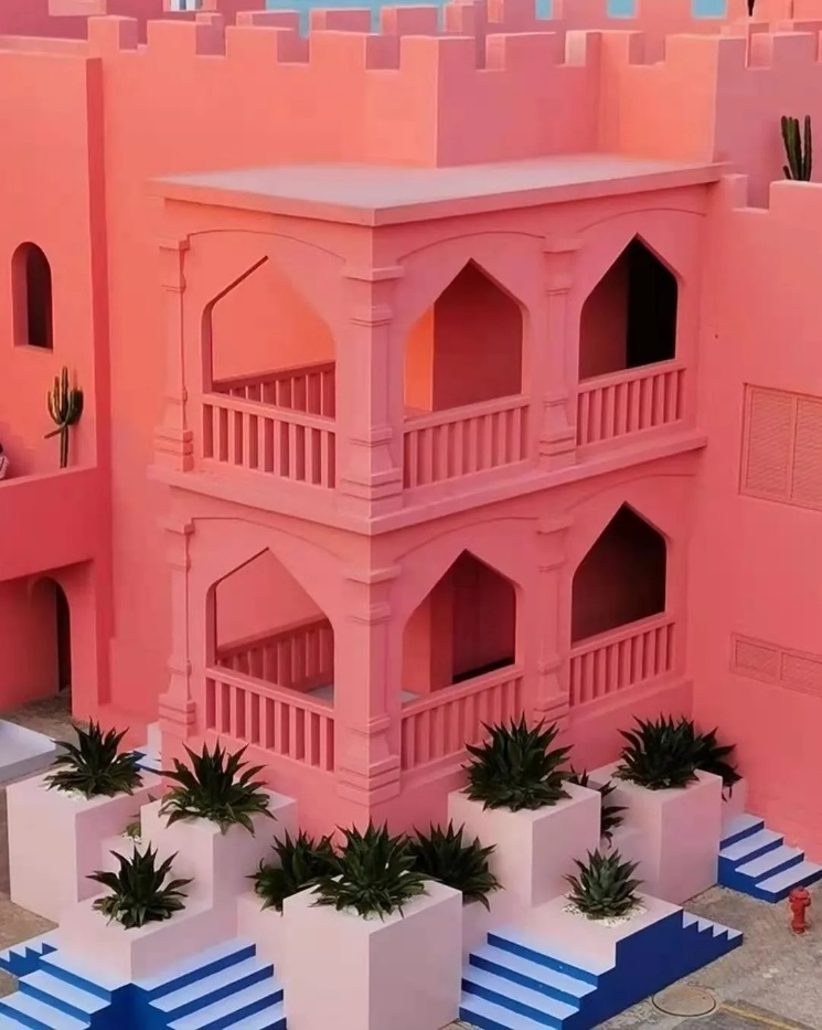 一座粉色的城堡,错落有致的结构建筑
